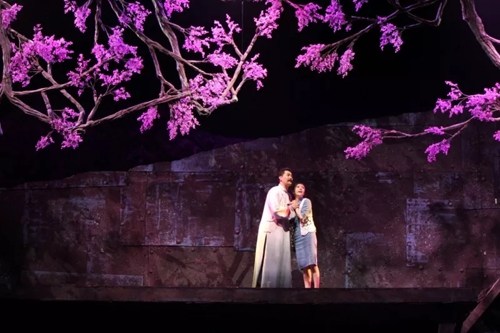 在李大钊与妻子生死诀别的时刻,剧场上空垂下了盛放的丁香花,结合绞刑架的背景,更加令人动容。